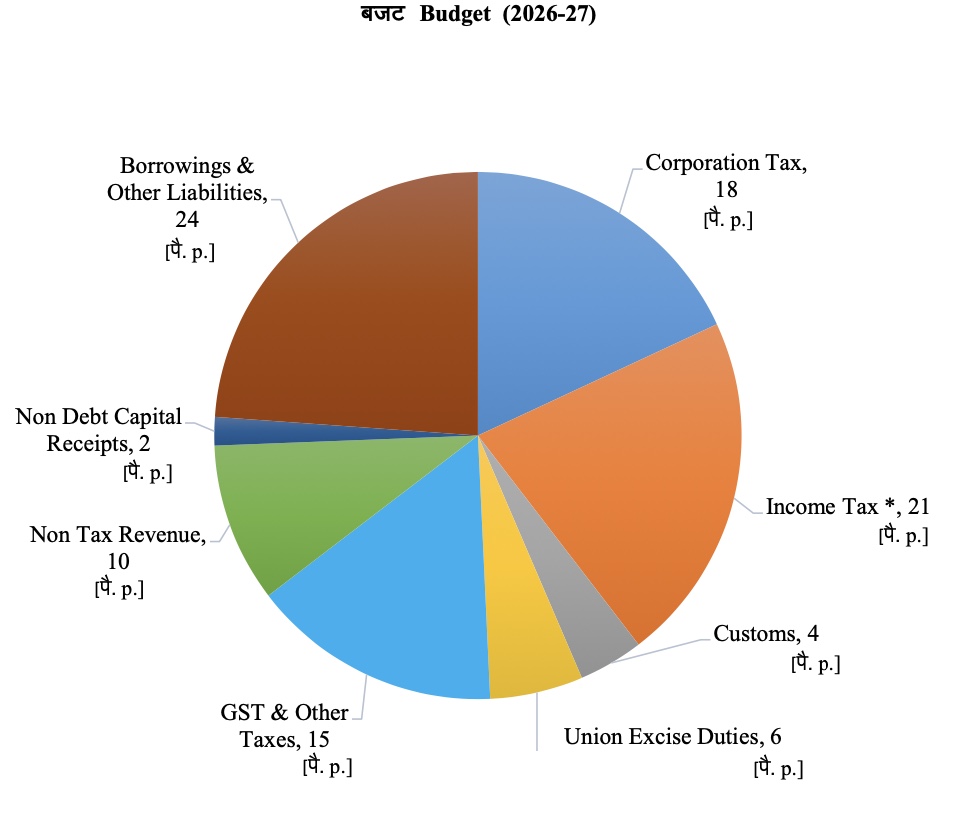 Budget 2026–27 pegs total receipts at ₹53.47 trillion. A comparison of how a rupee comes in and where it goes, based on the Union Budget 2026–27 charts, points to continuity rather than disruption.