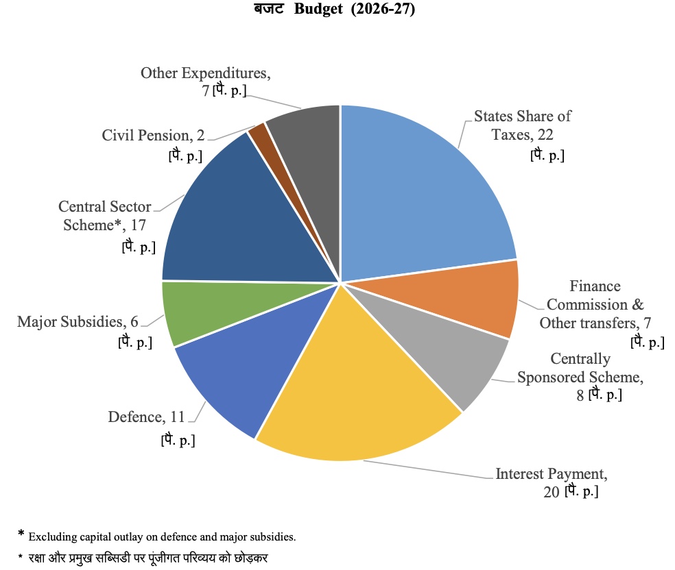 On the receipts side, the overall structure remains stable, with taxation and borrowing continuing to dominate. Direct taxes, though, show a subtle shift in composition. Income tax accounts for 21% of total receipts in 2026–27, down from 22% in 2025–26, while corporation tax rises to 18% from 17%, signalling confidence in corporate profitability and compliance-led buoyancy.