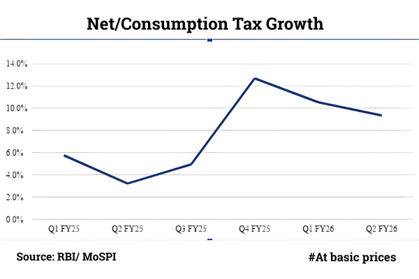 This gap has implications for consumption demand and the expenditure side of the economy, which is concerning for a domestic demand-driven economy like India. Interestingly, this occurred despite healthy growth in consumption taxes in July-September, which rose by 9.3%. Although slower than in the previous two quarters, this growth suggests robust household spending. Yet, it is not fully reflected in the aggregate demand data.