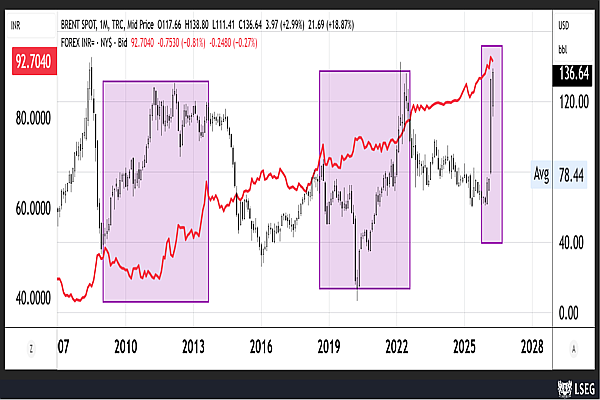 Second, a sharper depreciation of the rupee is expected. Figure 2 plots monthly brent crude prices (candlesticks) alongside the rupee (line graph). Three major depreciation episodes are highlighted: the 2013 taper tantrum (₹68 per USD); the 2018–19 phase (high of ₹74); and the 2022 episode (nearly ₹83). Each coincided with an underlying rise in crude prices, as highlighted by the rectangular bands. The current episode, as the monthly candle clearly indicates, is a tectonic geopolitical crisis for crude: the sharp and discontinuous move implies that exchange rate pressures may persist, with longer-term macroeconomic repercussions.