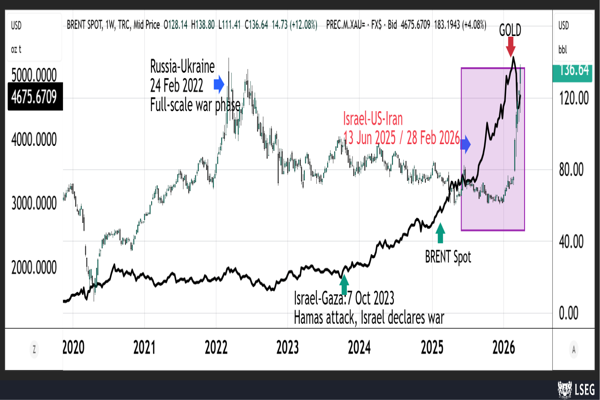 During the Russia-Ukraine conflict, crude prices spiked sharply and gold initially surged before stabilising. From the 2025 Israel-Gaza conflict onwards, gold exhibited a stronger upward trajectory even as crude remained relatively contained. The ongoing US–Israel–Iran conflict departs from both patterns: crude surged sharply, while gold presumably corrected.