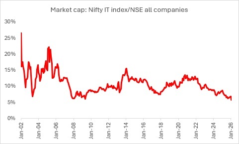 Since the global financial crisis, Indian IT’s share of US technology market capitalisation has shrunk materially. The sector has remained profitable and cash generative, yet it has not meaningfully participated in the value creation seen in US platform companies. The gap reflects structural divergence.
