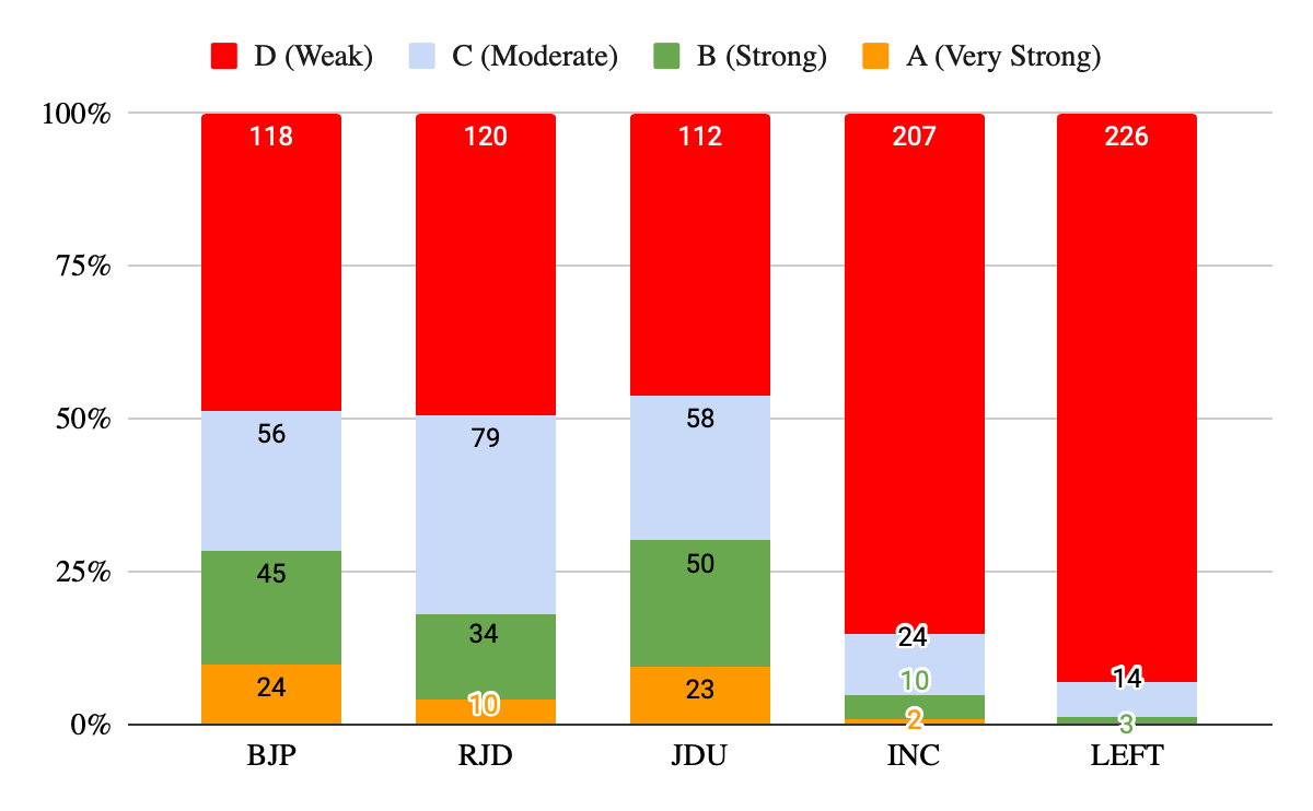 JDU and BJP have 23 and 24 “A” Category seats, while RJD has just 10, Congress two such seats. JDU and BJP have 50 and 45 “B” Category seats, while RJD has 34, Congress 10 and Left Parties 3 such seats. JDU and BJP have 58 and 56 “C” Category seats, while RJD has 79, Congress 58 and Left Parties (CPI, CPIM, CPIML) 14 such seats.