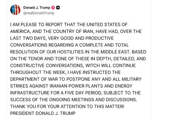 US President Donald Trump has instructed the Pentagon to postpone military strikes against Iranian power plants and energy infrastructure for five days, signalling a possible diplomatic pause in a conflict that has escalated sharply in recent weeks, according to a post on Truth Social platform.